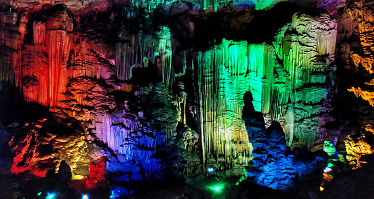 一個巨大的喀斯特溶洞,位于湖心島上。洞內(nèi)空間開闊,鐘乳石形態(tài)各異,在五彩燈光的映襯下,呈現(xiàn)出光怪陸離的景象,仿佛進入了一個神秘的地下世界。洞內(nèi)還有地下河,河水清澈見底。需乘船抵達島上,游覽時間約 1 小時,參觀時需跟隨導游,注意安全。